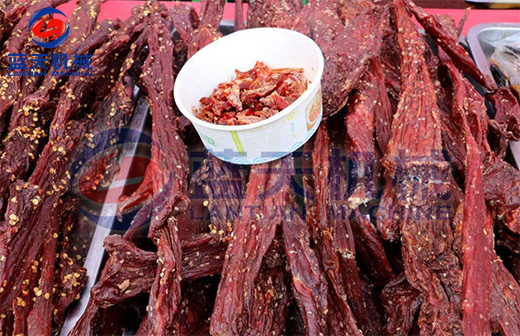 牛肉干的生產(chǎn)工藝流程:選料→腌制→烘干→冷卻→包裝
