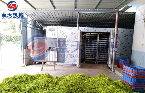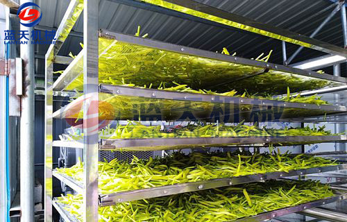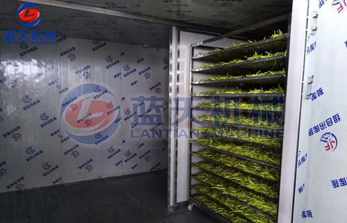 先把黃花菜均勻的攤放在推車托盤上,推車托盤最要用不銹鋼制作的,有利于加快干燥的時(shí)間。每層大約攤放7公分厚。層與層之間要預(yù)留8公分的距離,確保每層的通風(fēng)效果。一部推車最好不要超過15層。裝好后放在烘干房?jī)?nèi)。