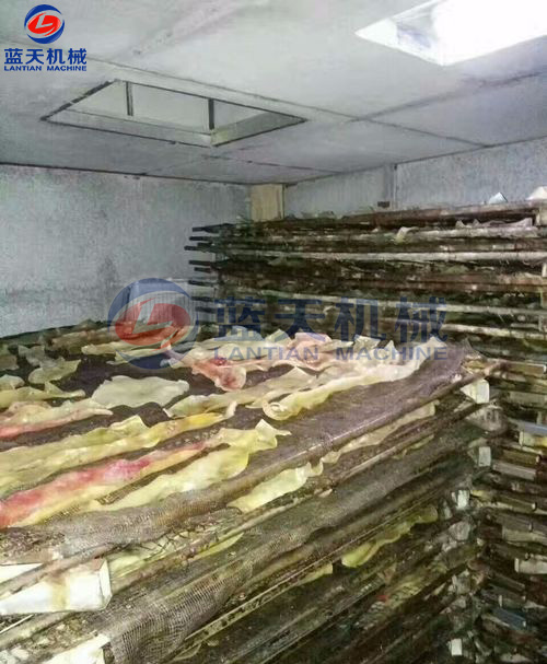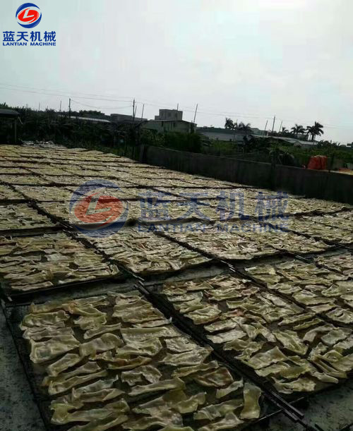 是利用太陽曬干的,整個過程需要持續四五天的時間,還需要工人在現場看管,但也避免不了蟲蟻灰塵的污染。如遇上陰雨天,豬皮曬干不及時就可能走味,給豬皮的干燥帶來諸多麻煩。