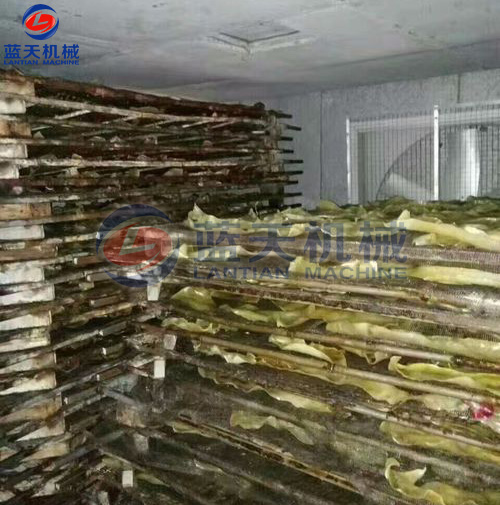 可選用煺毛后的、無疫病、無疤痕的豬皮。先將剝下的豬皮放入溫水中浸泡30分鐘,然后用竹刷或塑料刷刷洗,用刀刮除表皮上的污物,修凈污物,去凈雜毛并采取連根拔除的方法,盡量不用利刀刮毛的便利方法,避免將毛根留在肉皮內而影響成品品質,將殘留的肉皮表面的脂肪用刀修理干凈,要求不得殘留一絲脂肪,以免影響油爆漲發的程度,然后將清洗干凈、已去除脂肪的豬皮進行分切整形(有些地區的傳統工藝需要蒸煮后在分切),分切快形大小在5-10平方厘米之間,不得超過10平方厘米,否則油爆漲發后包裝困難,小于5平方厘米的自然皮塊也可以加工,無需再切成小塊和整形,否則經包裝、運輸、銷售環節后容易造成碎塊,根據市場需求也可以將豬皮切絲、切丁等形狀,以滿足不同的客戶需求,將切好的皮塊放入物料網格盤,將物料網格盤像抽屜一樣插入物料車,將物料車推入烘干房,關閉封閉門,烘干就可以開始了。