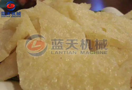 在油爆漲發前,豬皮需要在溫油中回軟,這是能否漲發的關鍵,油溫應該掌握在40-50度左右,溫度高了也會影響漲發的程度,是否回軟達標、視肉皮軟塌程度確定,這項操作標準在文字上無法準確清楚表述,只有在加工過程中熟能生巧,最終生產加工經驗是主要的。回軟后的待油爆肉皮應該保持回軟狀態不能回硬,將鍋中油溫升到80度后即可將肉皮放入油鍋中,邊翻動邊加溫,油溫達到120度時豬皮就可以漲發好了,在漲發時油溫應掌握好,不得過高,關鍵是保持不焦不老不黃的感官程度和完全漲發開的標準,完全漲發后的皮肚,從熱油鍋內撈出后應當控盡油脂并冷卻到常溫后方可包裝。不得未控盡油脂和降低溫度就進行包裝,否則既影響包裝又影響產品質量。