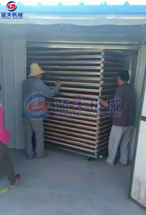 鮮果由于果內的水分外滲,皮層聚集充分的非結合水分,這是因為表面的水蒸氣壓與溫度氣壓基本相同,壓迫果實內部水分很快移向表面以滿足表皮水分汽化的需要。果實內失水率達到近50%時,室內溫度自然上升到50℃-55℃,循環(huán)風速可有所下調,果內含水越少,脫水時間越短。此期歷時12小時左右。大量地脫水使果實體形縮小,即平常說的呈半干狀態(tài),此期稱重測水,果實內含水30%左右。